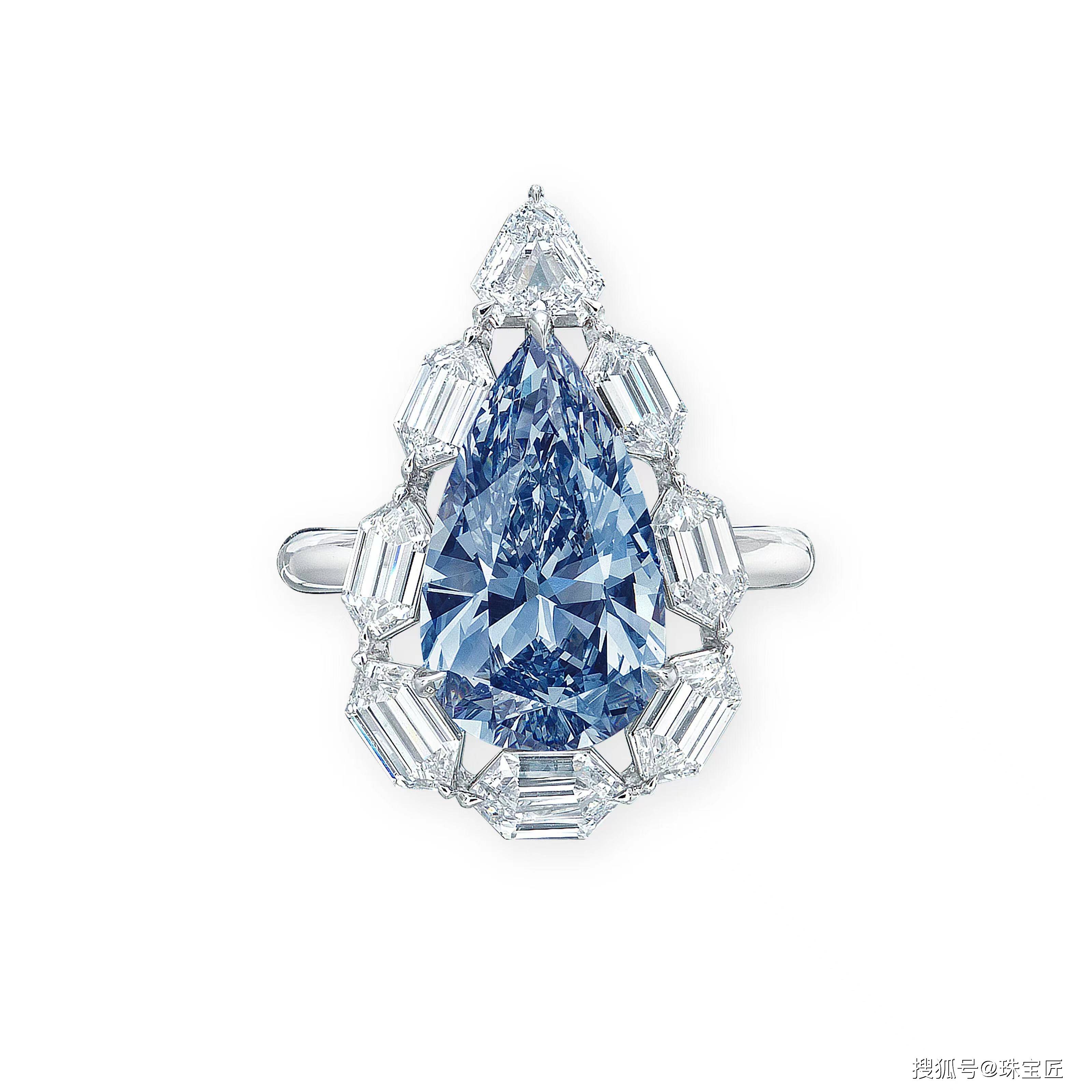 这枚蓝钻戒指,主石是一颗4.83克拉、梨形、艳彩蓝色IF Type llb 钻石,内部完美无瑕,净度极佳,拍卖前的预估价为HKD55,000,000——HKD 80,000,000,最终成交价为HKD68,925,000,成为本场成交价最高的拍品;
