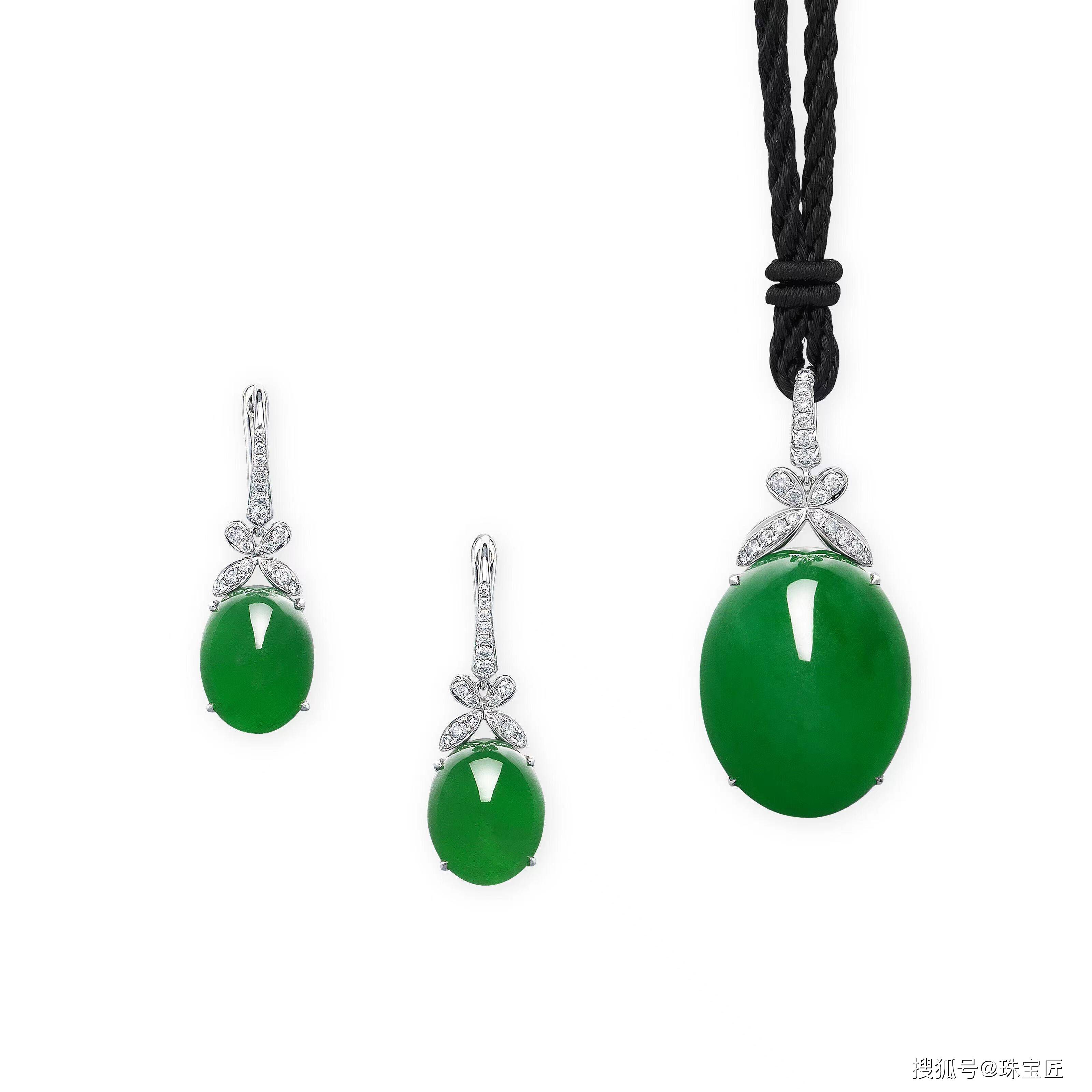 翡翠及钻石首饰套装,由翡翠吊坠和翡翠耳环组成,最大蛋面为25.9*20.3*10.3mm,吊坠长4.3cm,项链长63.6cm,耳环长3.4cm;