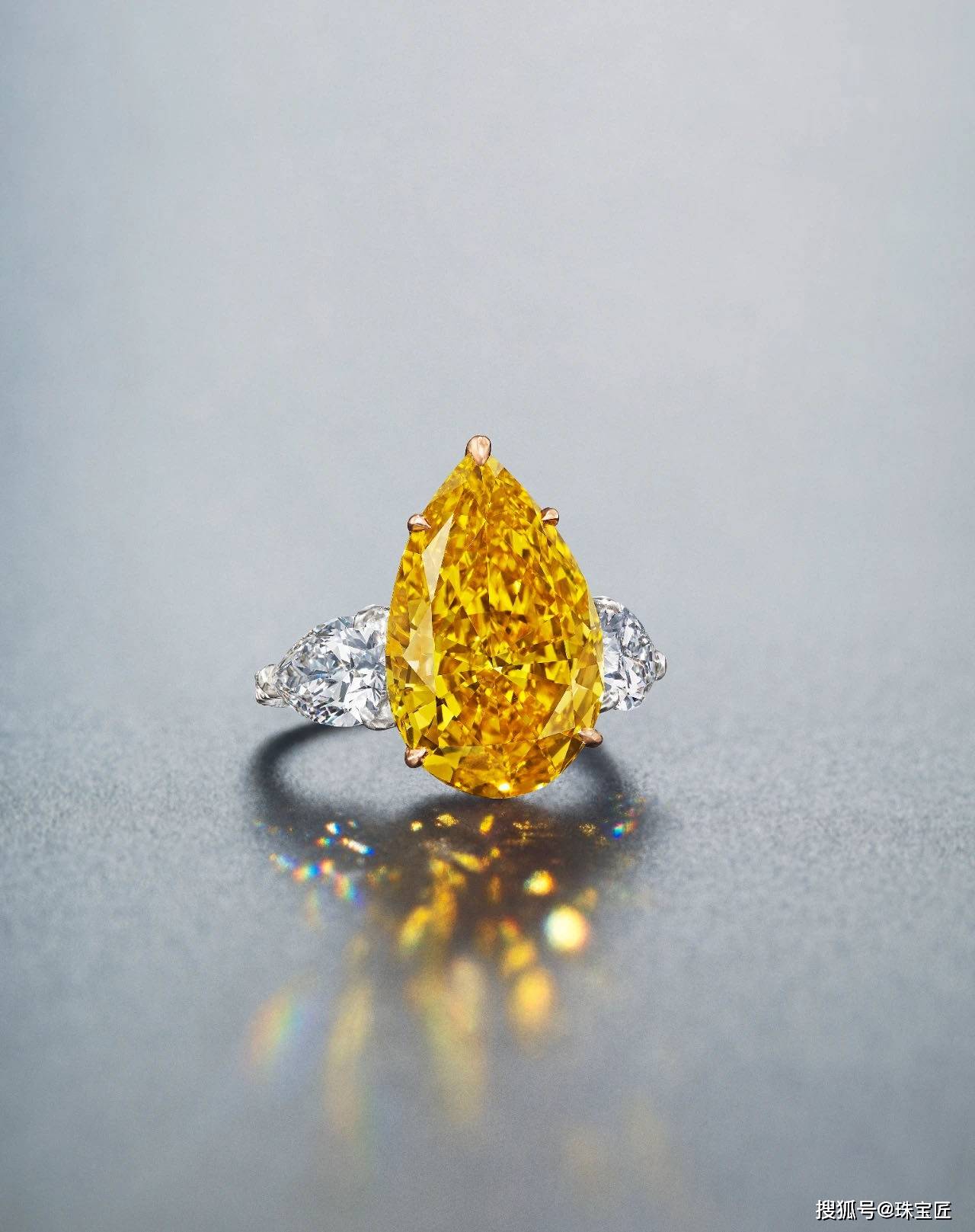 这枚黄钻戒指,主石重达8.92克拉、采用梨形切割,色彩达到了黄钻的最高等级:【艳彩黄色】,配1.12及1.11克拉梨形钻石作为点缀,附GIA证书。