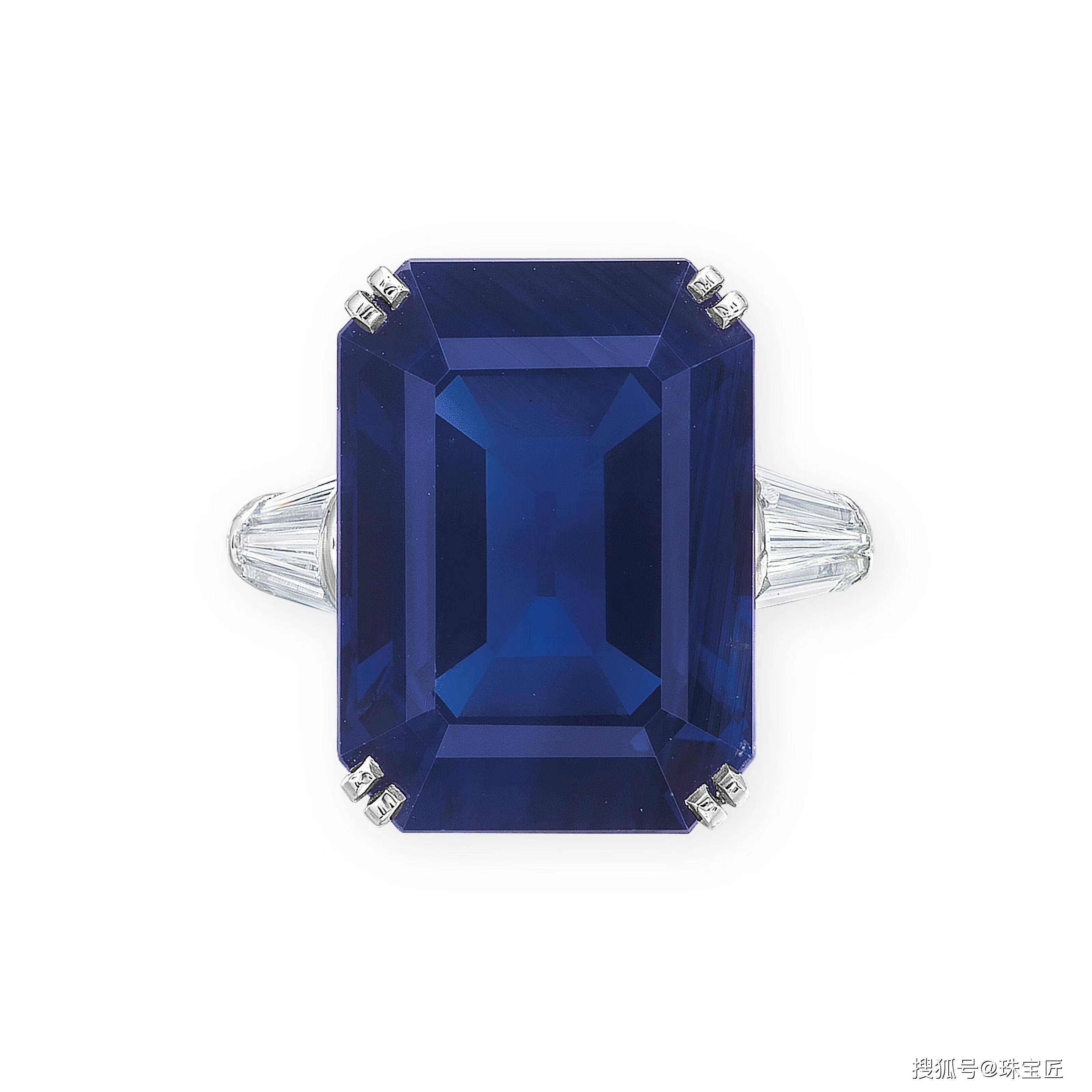主石为天然皇家蓝蓝宝石,出自蓝宝石的传奇产地——已经绝矿了的克什米尔,重21.38克拉,采用长方形切割,戒臂以钻石作为点缀,附SSEF、古柏林、AGL证书;