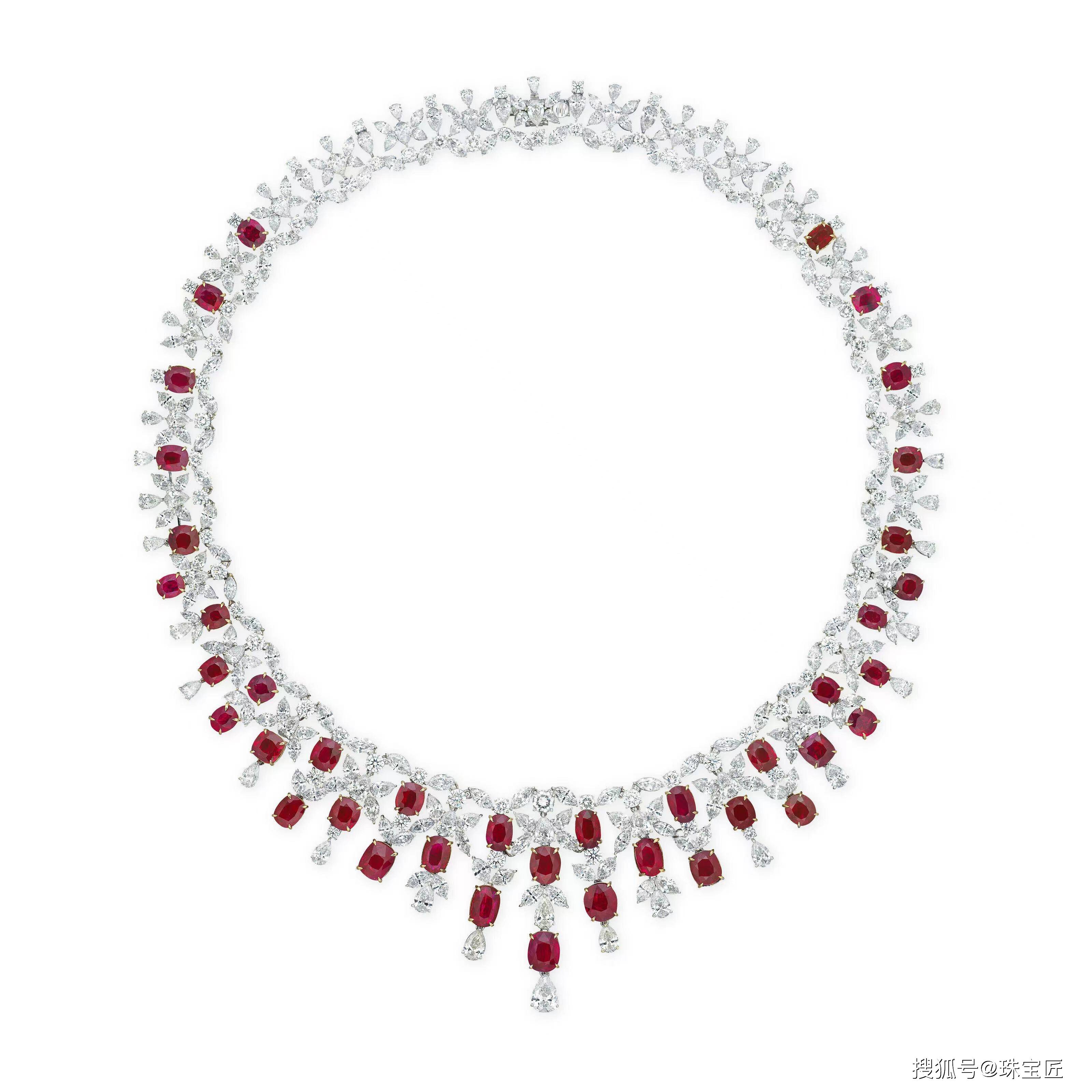 红宝石及钻石项链,项链内周长40.5cm,由红宝石和钻石镶嵌而成,红宝石为鸽血红级别,枕型,产自缅甸,附古柏林证书;