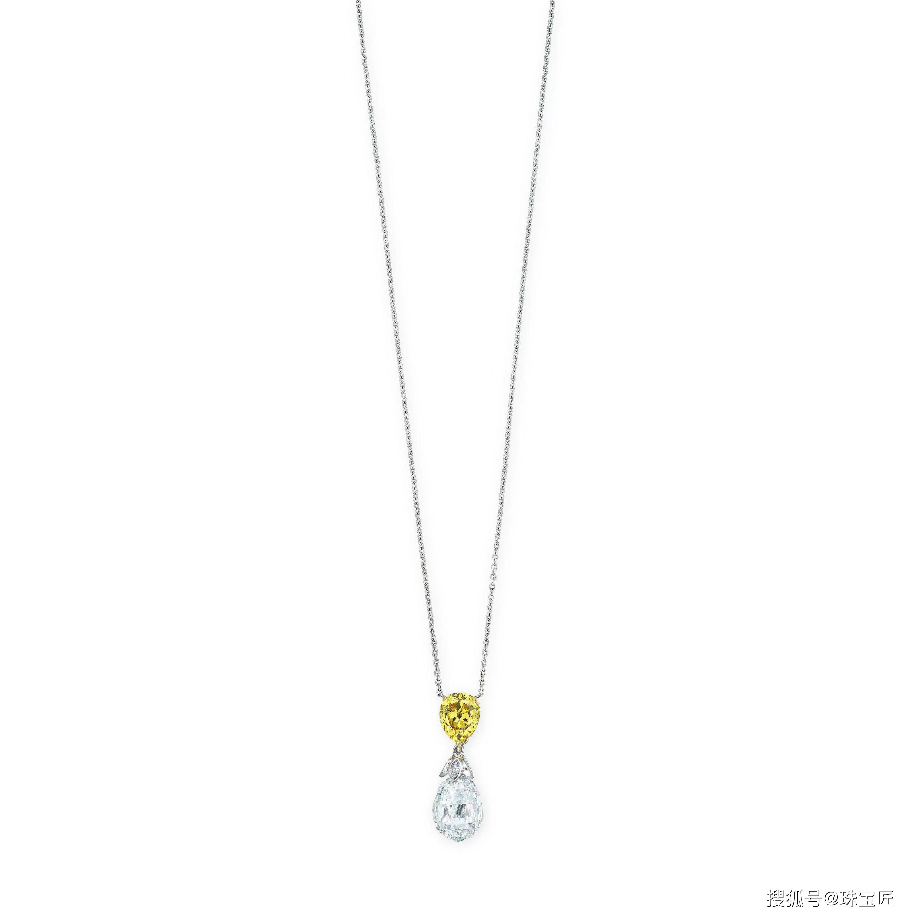 黄色钻石及钻石吊坠项链,主石是一枚8.87克拉、VS1钻石,配以一颗3.53克拉梨形艳彩黄色VS1钻石,项链长47cm;