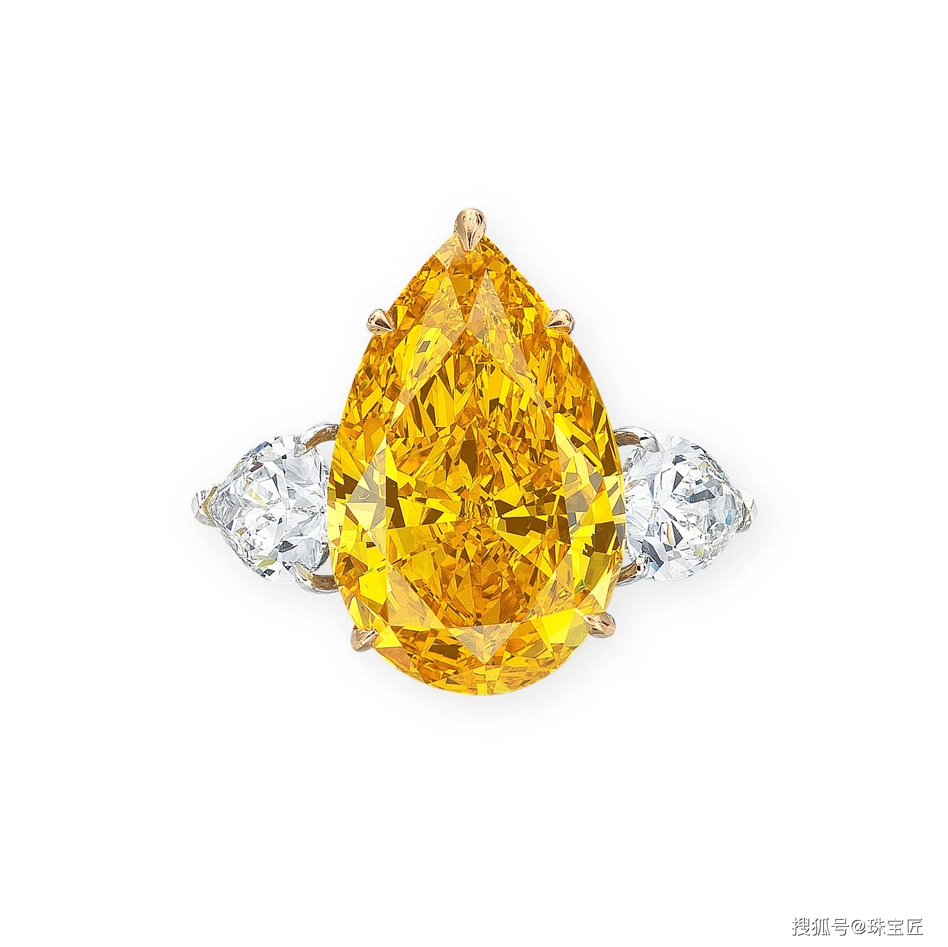 成交价仅次于这枚蓝钻戒指的钻石类拍品,是一枚8.92克拉梨形艳彩黄橘色IF钻石戒指。