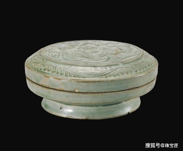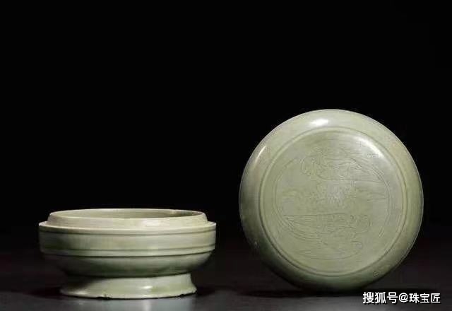 北宋越窑青釉划花鹦鹉牡丹纹盒