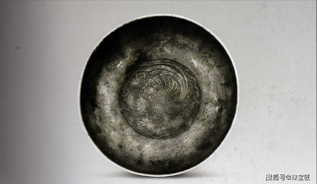 比如,同样出自何家村窖藏的葡萄龙凤纹银碗,高4.2cm、重158克,外腹部以葡萄、忍冬、卷草缠绕布局分成六区,三鹦鹉、三奔狮间隔刻于每区花草的中心部位,碗内底部刻有走凤一只,并饰以葡萄、忍冬、卷草等纹样。