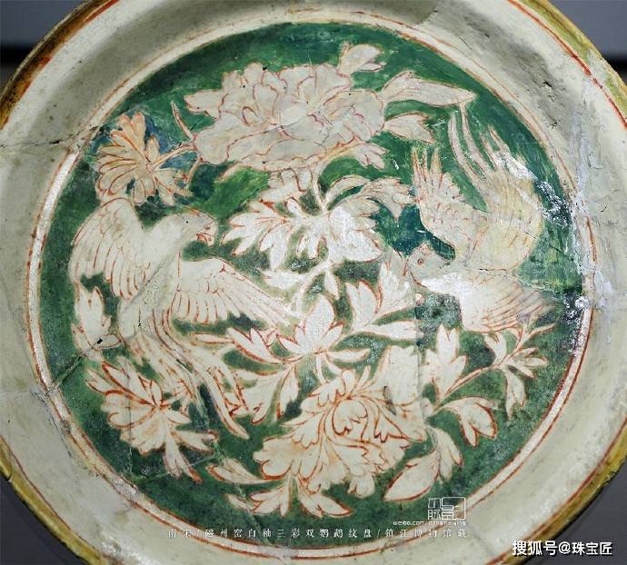 镇江博物馆 南宋 磁州窑白釉三彩双鹦鹉纹盘 图源:动脉影