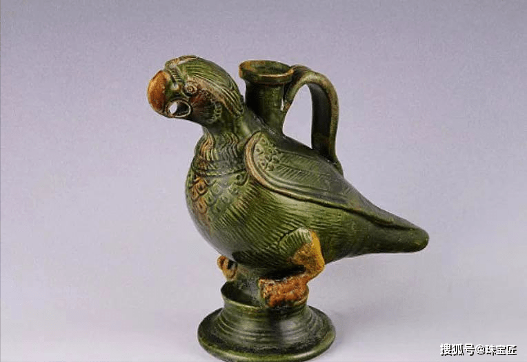 唐 黄绿釉鹦鹉形提梁陶壶