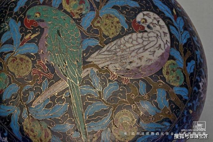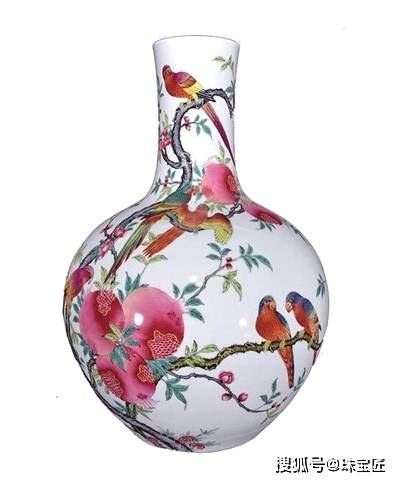 这件清代珐琅彩鹦鹉石榴纹天球瓶,高56cm,正面绘有完整的鹦鹉石榴纹图,数只羽毛鲜艳的鹦鹉站立在一颗果实饱满的石榴树上,有的鹦鹉在窃窃私语,有的站在高处眺望远方,鹦鹉造型逼真写实,栩栩如生,整体配色鲜艳明亮,极具特色。