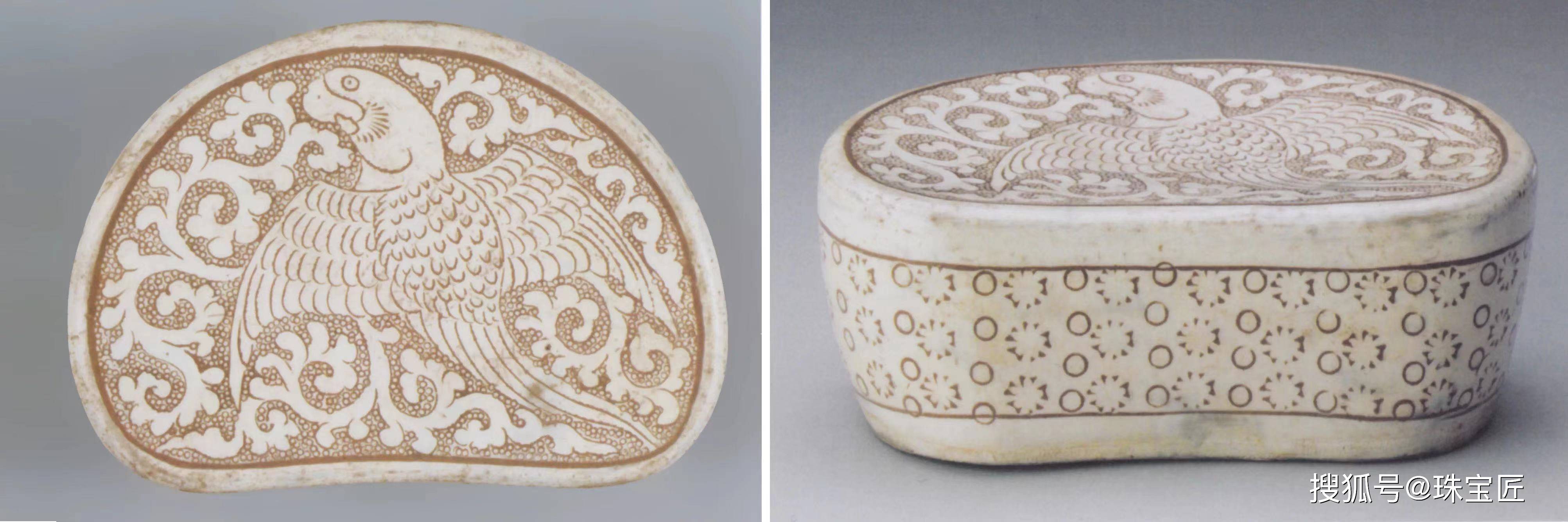 比如,这件现藏于中国国家博物馆的北宋登封窑白釉珍珠地刻花鹦鹉纹瓷枕,枕呈腰圆形,素底,枕面以戳印细密珍珠状小圆圈为地,枕面正中刻画鹦鹉纹和云纹等,鹦鹉振翅欲飞,在云间穿梭,意境感十足。