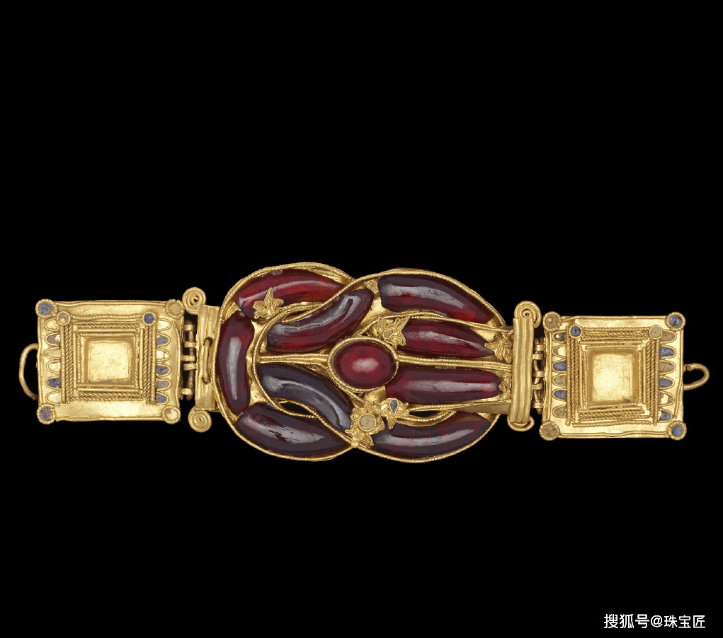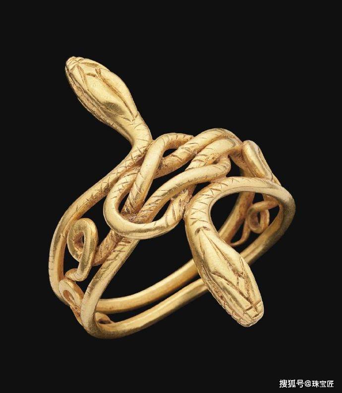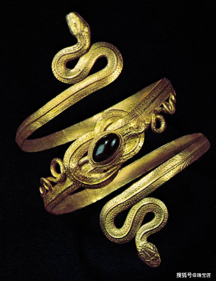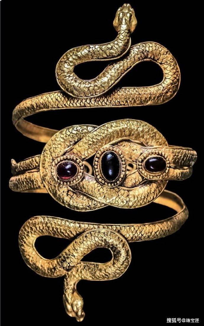 这款制作于公元前3世纪前后的双蛇造型臂环,两条尾部交叠的蛇通过赫拉克勒斯结连接在一起,中间点缀一颗巨大的石榴石。