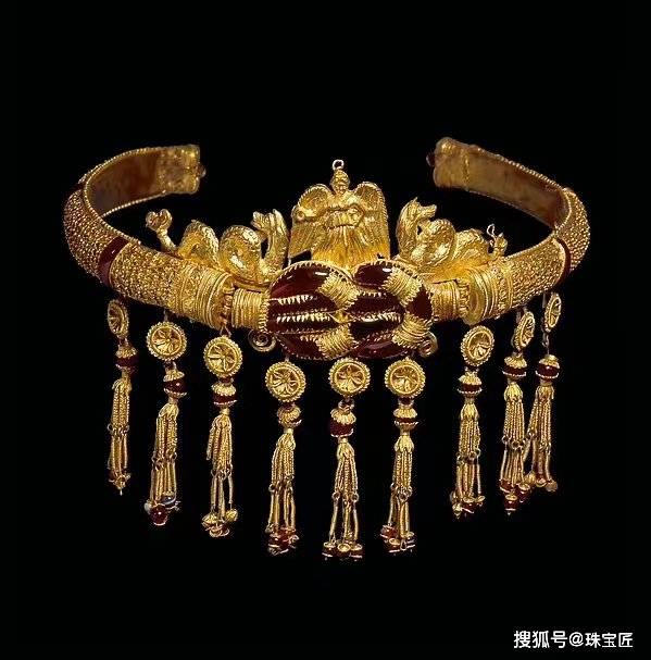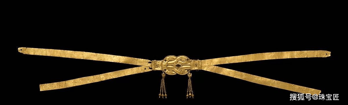 下面这顶制作于公元前300年——250年的金色交叉带王冠,虽然,在造型上简单了许多,但中间点缀的赫拉克勒斯结却十分出彩,两侧点缀的黄金流苏坠,随着身体的摆动,摇曳生姿,带有浓厚的浪漫主义色彩。