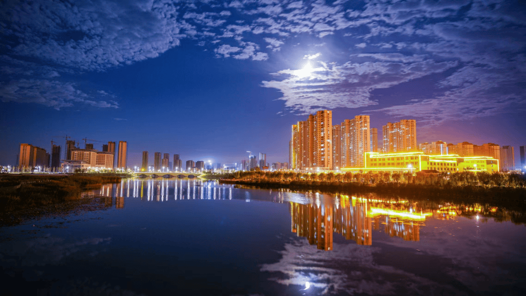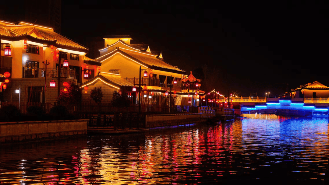 晚上游览成武县郜城水街。郜城水街傍水而建,夜晚灯火璀璨,水波浮动。四月的夜晚微风中已有暖意,在这样的夜里游水街,只需享受夜色与美食即可。