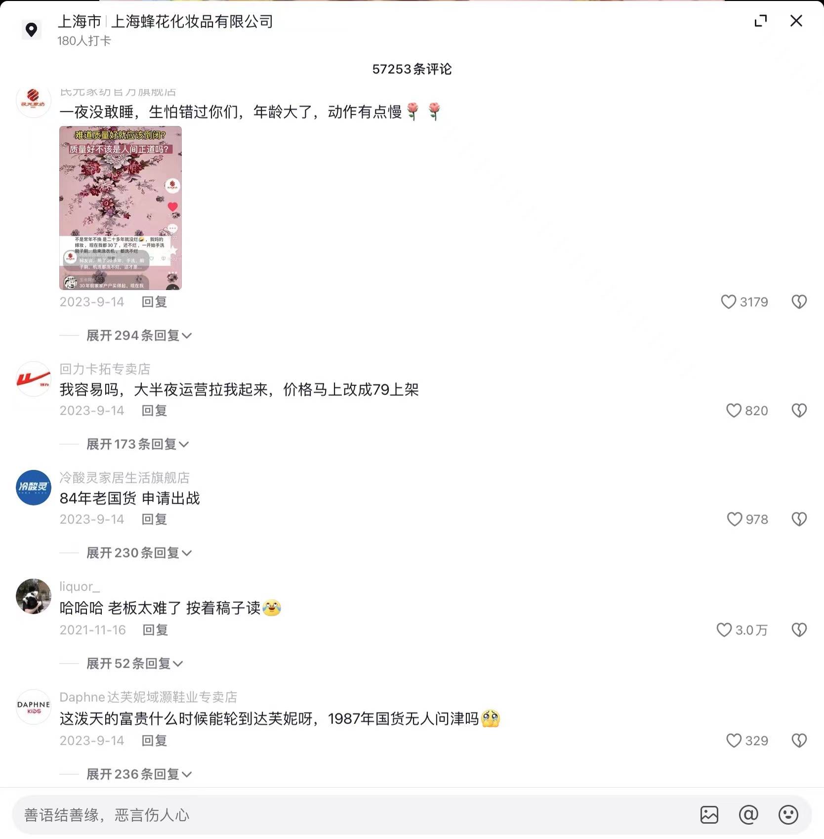 这些营销手段,在短视频时代已经不再奏效。去年9月,国货老品牌蜂花靠“拉踩”李佳琦的言论一举翻红,无数国货品牌也闻风赶到蜂花官方抖音的评论区,表示“让我也挤挤”“我也想蹭点”。这场朴实无华的商战,也侧面反映了传统企业对于流量的焦虑。