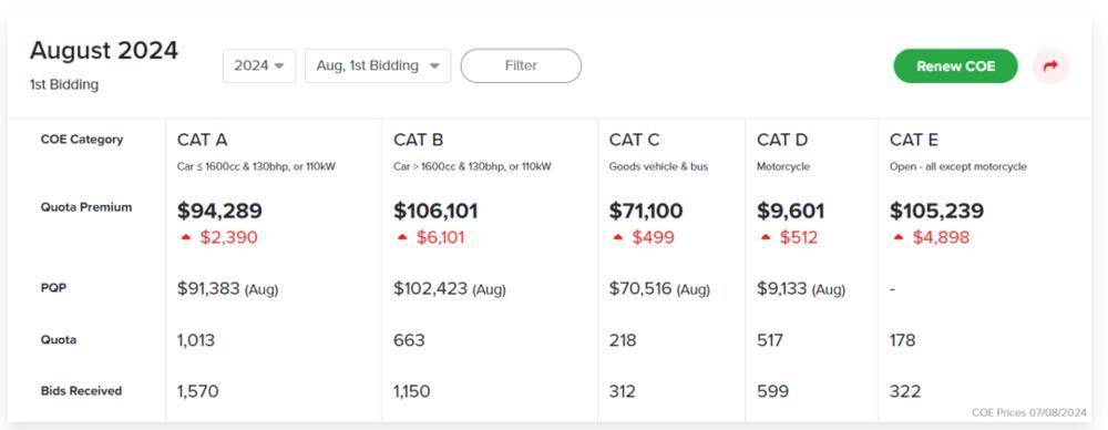 如今这张证的价格,可以用令人咋舌来形容。今年4月,大型及豪华车组和公开组的拥车证价格,已经突破10万新元(约合人民币54万),最高价18万新元(约合人民币97万)。而最新的数据显示,8月份豪华车组(CAT B)的拥车证第一轮招标价再次上涨,已来到106101新元,不夸张地说,单是一张拥车证的价格就足以在国内买一辆中档BBA了。