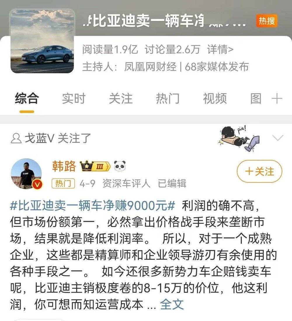 今年4月9日,“比亚迪单车净赚9000元”的微博话题登上了热搜。事实上,这9000元给的还是保守了,2023年比亚迪一共卖出302.4万辆车,创造了300亿人民币的净利润,以均价15.98万元计算,每卖一辆车净赚约8600余元。
